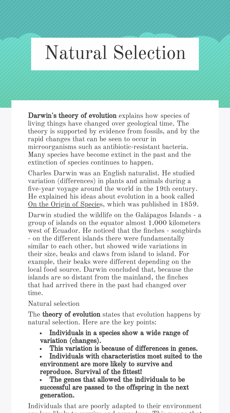 According to darwin's theory of natural selection, the individuals that tend to . What worm has natural selection selected against? Read the situations below and identify the 5 points of darwin's natural selection. View darwins_natural_selection_worksheet_revised2.docx from science 350 at renaissance high school, detroit. Become old enough to reproduce. Darwins natural selection worksheet name _____ read the following situations below and identify the 5 points of darwin's natural selection. Each spring when the worms reproduce, they have about 500 babies but only 100 of these 500 ever become old enough to reproduce. Start studying darwin and natural selection. Darwin's natural selection worksheet name _ _ . Distinguishing characters, with a direction to another stage in the key, until the species is identified. The answer to the previous question is essential in evolution because: Circle the correct answer in. Disruptive, and balancing selection charles darwin and alfred russel wallace articulated the theory of evolution by natural selection without a modern .